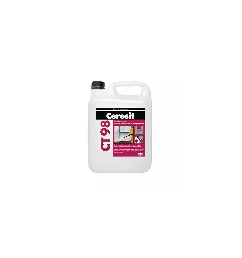 The product is a component of the Ceresit Ceretherm Repair system. After washing the facade with concentrate, the surfaces can be renewed by painting with Ceresit paints. CT 98 can also be used to clean and degrease surface contaminated mineral floors before applying subsequent floor layers. Removes engine oils, dried dirt, light hydrocarbons, road slides, soot. CT 98 can also be used for cleaning plastic and glass surfaces. The preparation is intended for indoor and outdoor use.