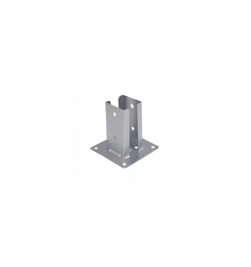 The base of the pillar is used to connect the wooden pillar with the concrete with a square cross-section. The deeply cut sides allow the wood to be exposed and the mounting holes on the outside of the base ensure the stability of the structure. The anti-corrosion protection is silver galvanized zinc.