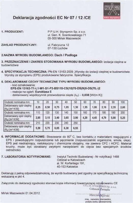 Styropmin Deklaracja Zgodności Dach - Podłoga EPS - 038