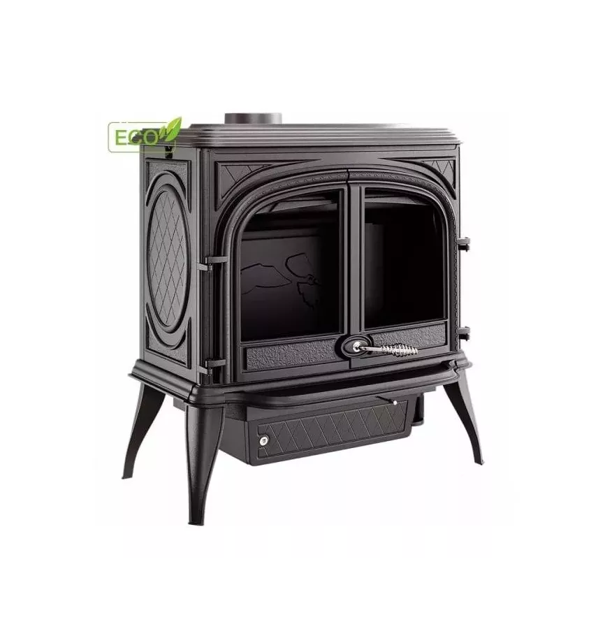 Piec kominkowy wolnostojący na drewno, wykonany z żeliwa wermikularnego. Zgodny z wymogami ekoprojektu.