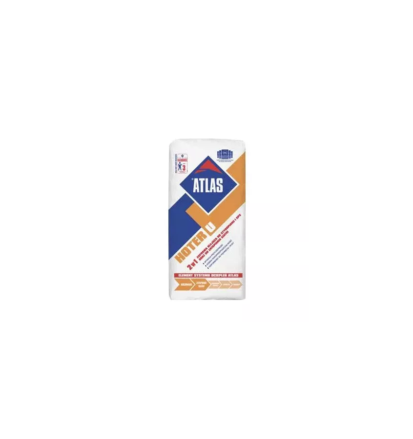 Atlas Hoter U- zaprawa klejąca umożliwia wykonanie warstwy zbrojonej oraz przyklejanie płyt styropianowych lub XPS na betonie wszystkich klas, gazobetonie, tynkach cementowych, cem-wap. oraz na nieotynkowanych murach z cegieł, bloczków, pustaków i innych tego typu materiałach ceramicznych bądź silikatowych. Atlas Hoter U- zaprawa klejąca do styropianu do przyklejania płyt styropianowych i wykonywania warstwy zbrojnej w bezspoinowych systemach ociepleń. Można go stosować wewnątrz i na zewnątrz budynków bądź pustaków.