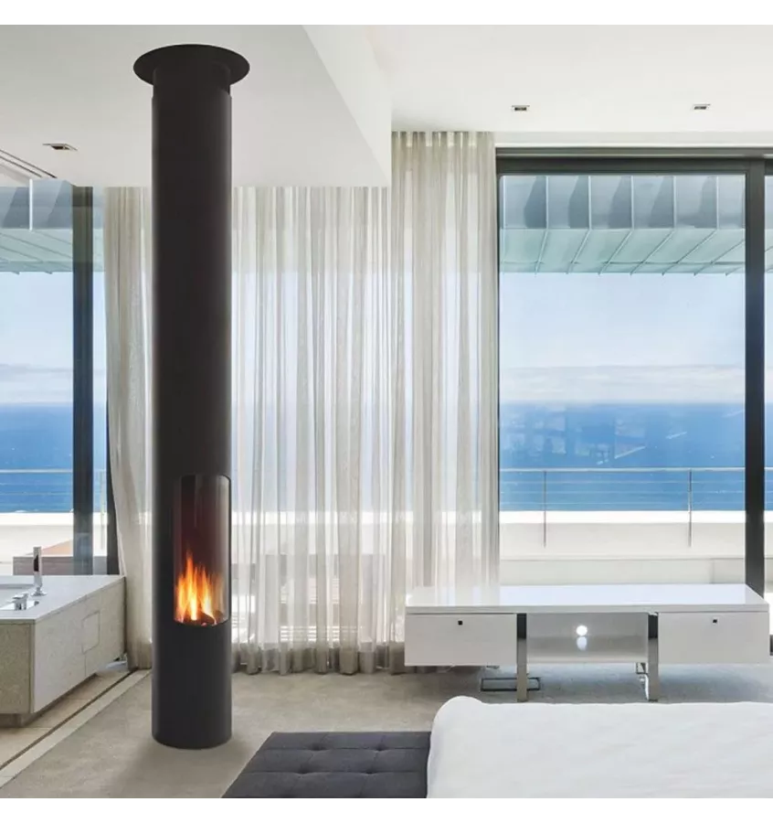 Centralny kominek gazowy z zamkniętą komorą spalania, wyglądający jak peryskop płomieni.