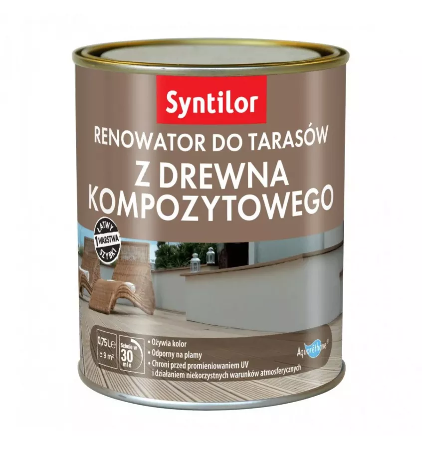 Renovátor teras v kompozitu Syntilor byl vytvořen speciálně pro kompozitní dřevěné povrchy, pro venkovní použití až 6 měsíců. Oživuje barvu a snižuje vyblednutí a nedostatek lesku.