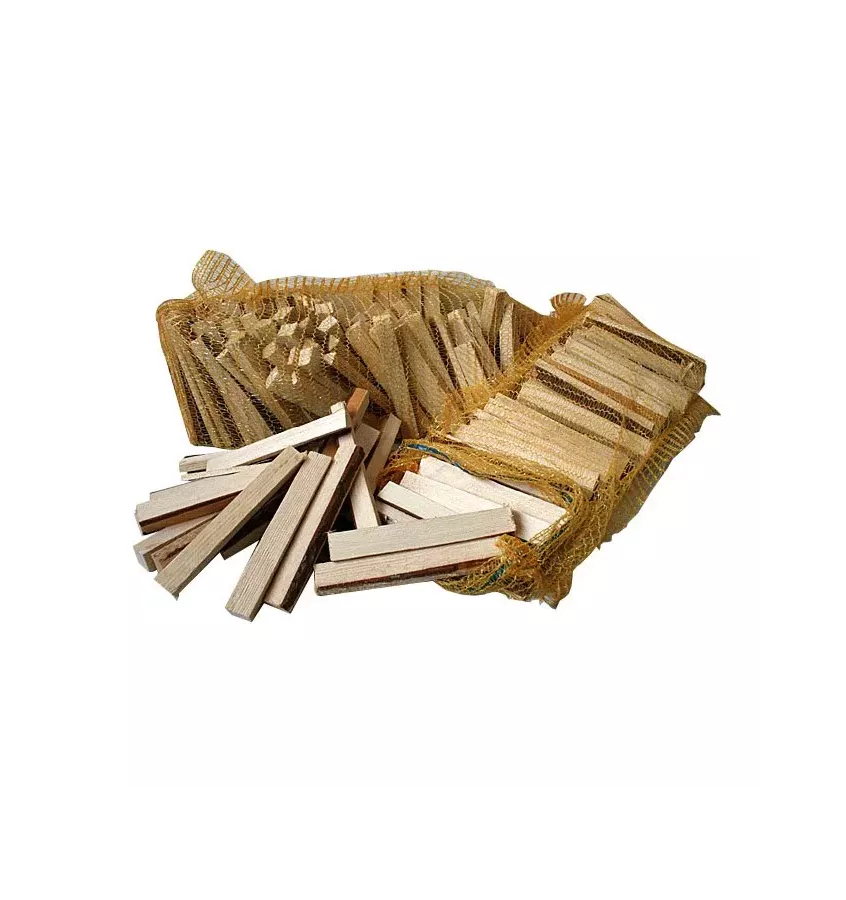 Kindling made of dry mixed, coniferous-deciduous wood. Easily cut pieces facilitate the lighting of briquettes or logs in fireplaces, stoves or boilers. Kinders of this type are available in many supermarkets throughout Europe.