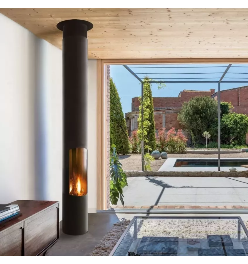 Designerski kominek na drewno Focus Slimfocus oparty na podłodze, nieobrotowy. Ten kominek to peryskop płomieni. Nadaje się zarówno na środek salonu, jak i do narożnika czy do umiejscowienia przy ścianie.
