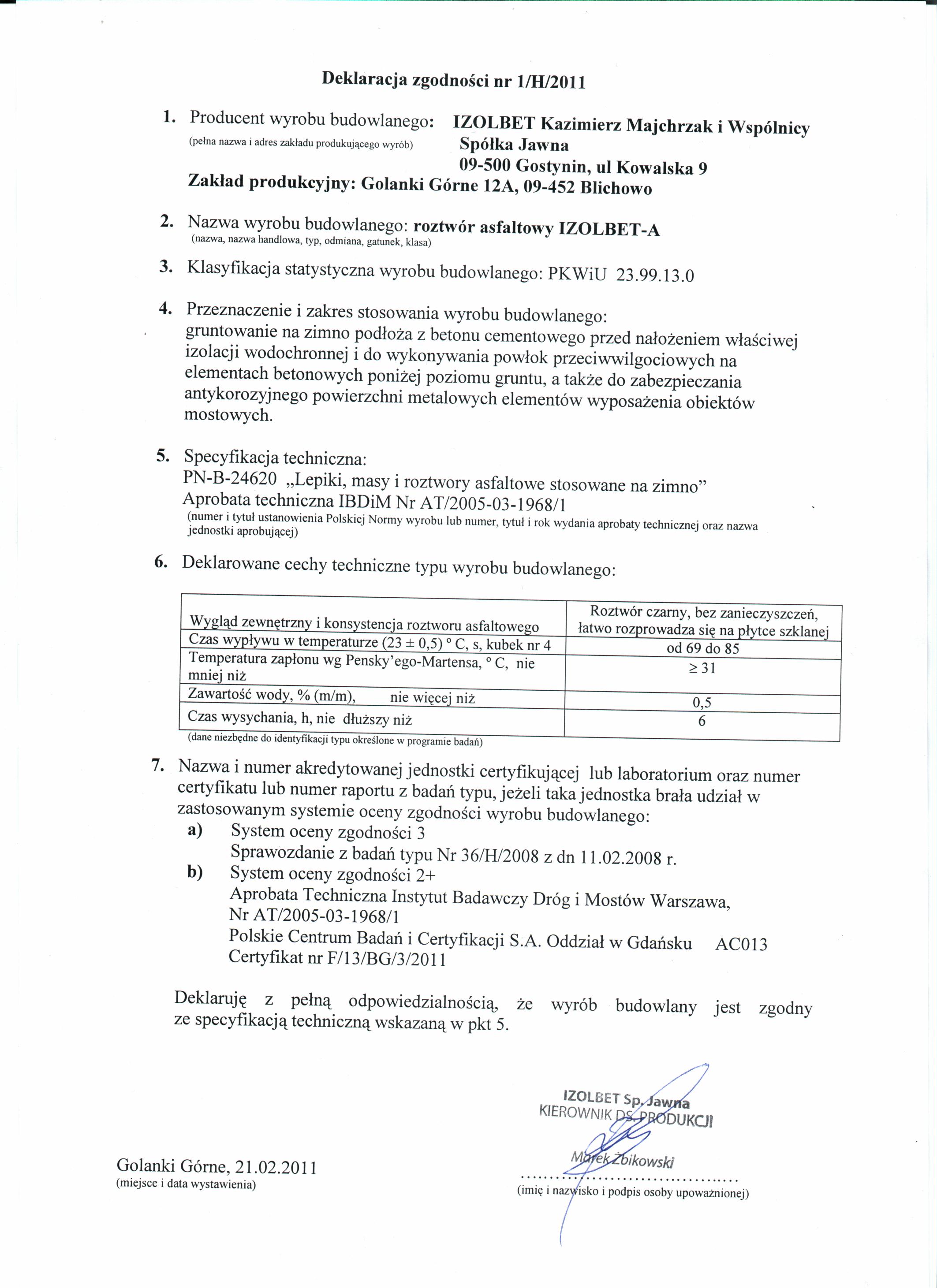 Download fileIzolbet roztwór asfaltowy gruntujący IZOLBET-A Deklaracja Zgodności