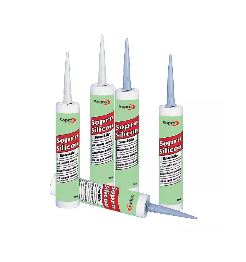 Sieciujący kwasem octowym kauczuk silikonowy bez oksymów do uszczelniania i elastycznego wypełniania spoin łączących i dylatacyjnych w obszarach sanitarnych, jak również na balkonach i tarasach. Do basenów zastosować dodatkowo podkład Sopro UW 025.