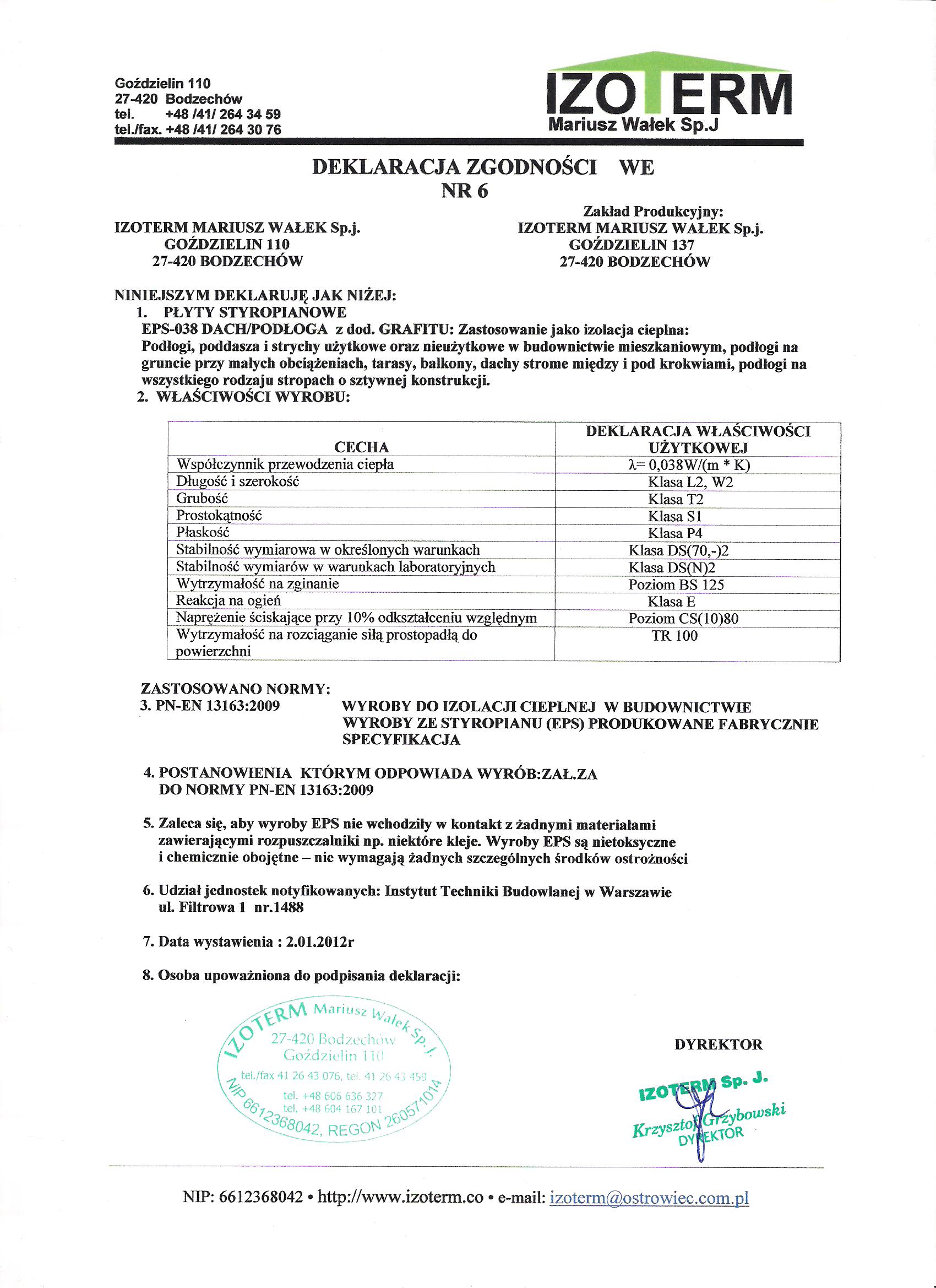 Izoterm Deklaracje Zgodności EPS 038 Dach/Podłoga
