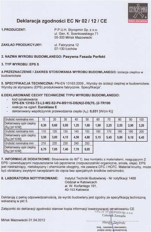 Styropmin Deklaracja Zgodności Pasywna Fasada Perfekt EPS 032