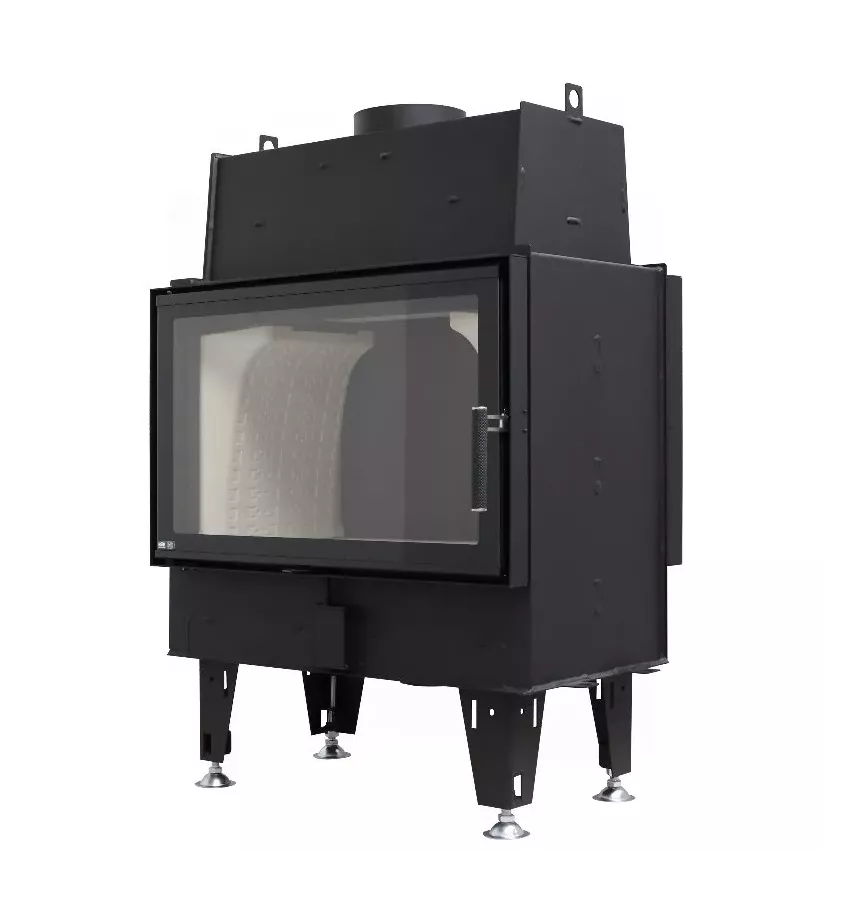 The model allows adding wood from another room, one glazed door and the other full carcon lined. Both doors open to the side. Smoking regulation on both sides. A grate hearth lined with Carcon. Deeper hearth without a barrier. Outdoor air intake with integrated manifold suitable for connecting automatic adjustment. Full door lined with vermiculite in combination with stainless steel. Special door profile enabling double glazing. Four-sided 90-degree mounting frame can be ordered