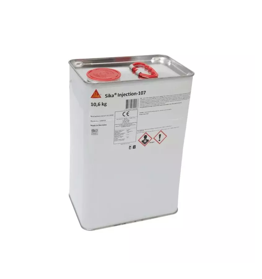 Sika Injection-107 to gotowa do użycia, jednoskładnikowa, lekko elastyczna, pieniąca się, poliuretanowa żywica iniekcyjna do wykonywania trwałych uszczelnień rys, szczelin i pustek w betonie. Produkt trwale uszczelnia mokre rysy i szczeliny w betonie, cegle i naturalnym kamieniu. Dostosowuje się do niewielkich przemieszczeń podłoża dzięki niewielkiej elastyczności.