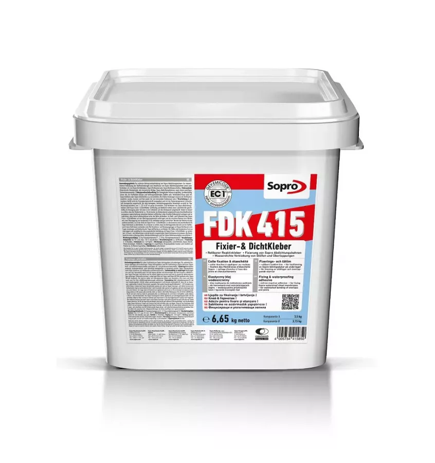 Cement, two-component reactive adhesive for application by roller or brush, used for gluing and fixing Sopro sealing mats on all standard substrates and for waterproofing the joints of edges and overlap areas of Sopro sealing mats and the assembly of tapes, gaskets and other Sopro sealing fittings.