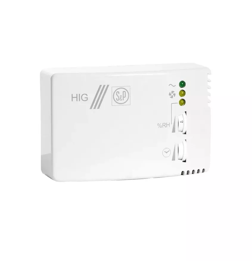 Czujnik wilgotności HIG-2 wyposażony jest w opóźnienie czasowe regulowane (1÷25 min). Urządzenie włącza lub wyłącza wentylator w zależności od wilgotności powietrza (zakres regulacji 60÷90% RH).
