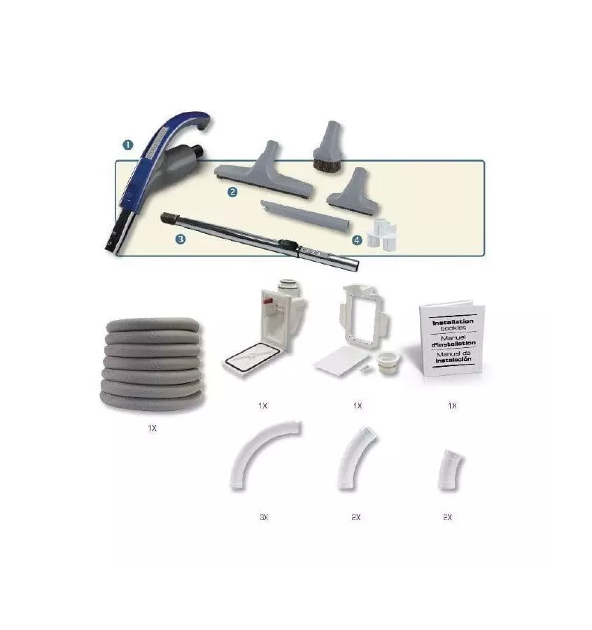 System węża chowanego w ścianie – kompletny zestaw do montażu Hide A Hose wraz z akcesoriami. Gniazdo, szczotki, i wężem o długości 9 / 12 lub 15 metrów.