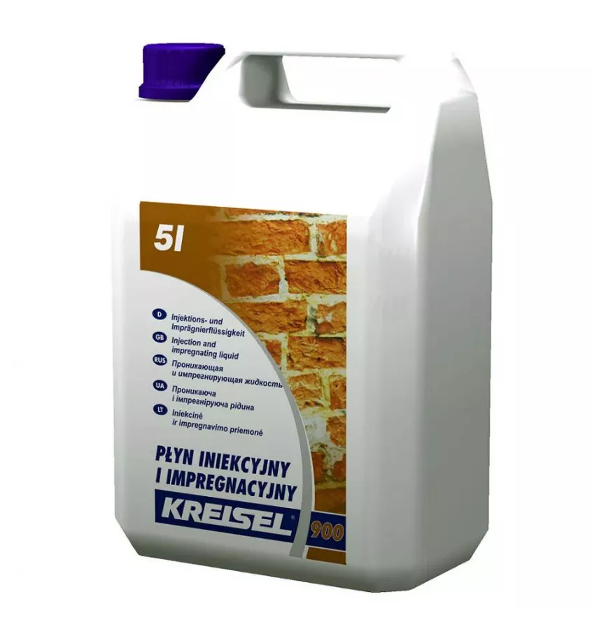 Płyn iniekcyjny i impregnacyjny 900 jest specjalistycznym preparatem o złożonym działaniu, przeznaczonym do wykonywania przepony poziomej chroniącej przed podciąganiem kapilarnym wody w materiałach porowatych w systemie tynków renowacyjnych KREISEL; do stosowania w metodzie grawitacyjnej oraz ciśnieniowej. Preparat ten służy także do impregnacji powierzchniowej materiałów porowatych w celu wzmocnienia osłabionej struktury muru i ograniczenia przedostawania się soli do tynku renowacyjnego lub na powierzchnię ściany. Nadaje się do impregnacji takich materiałów jak: kamień naturalny, tynki, cegły zwykłe, nasiąkliwe cegły klinkierowe. Płyn nie nadaje się do iniekcji w murach z dużą ilością pustek powietrznych.