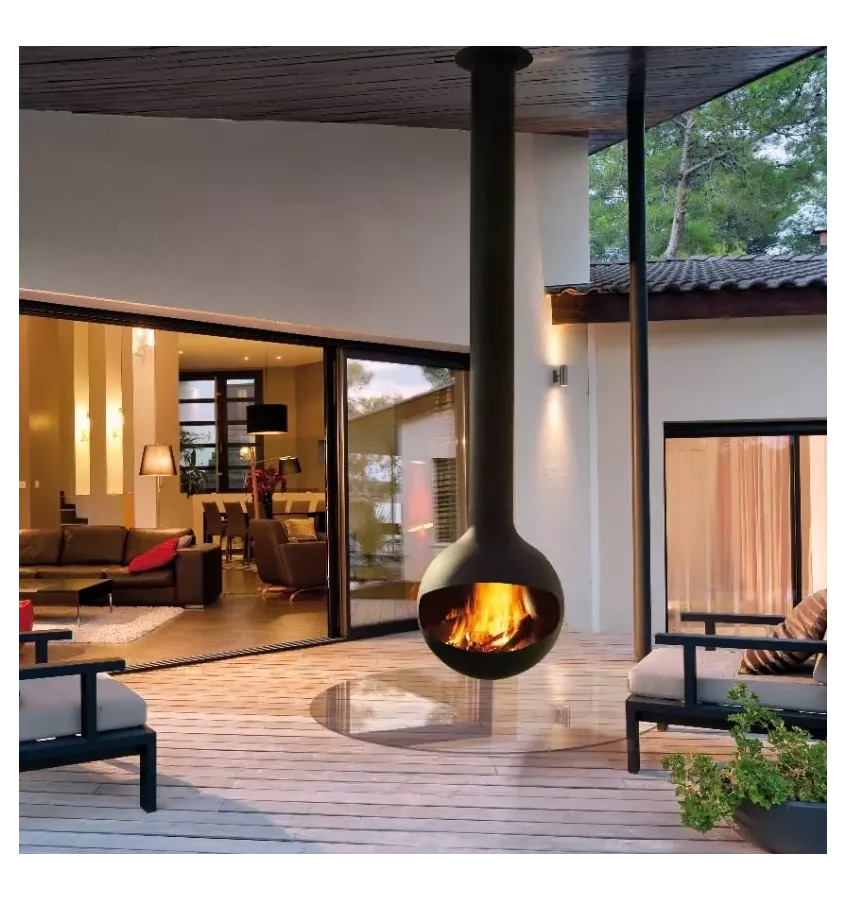 Designerski kominek na drewno Focus Bathyscafocus Outdoor podwieszany, obrotowy. Wersja czarna. Do zastosowań zewnętrznych.