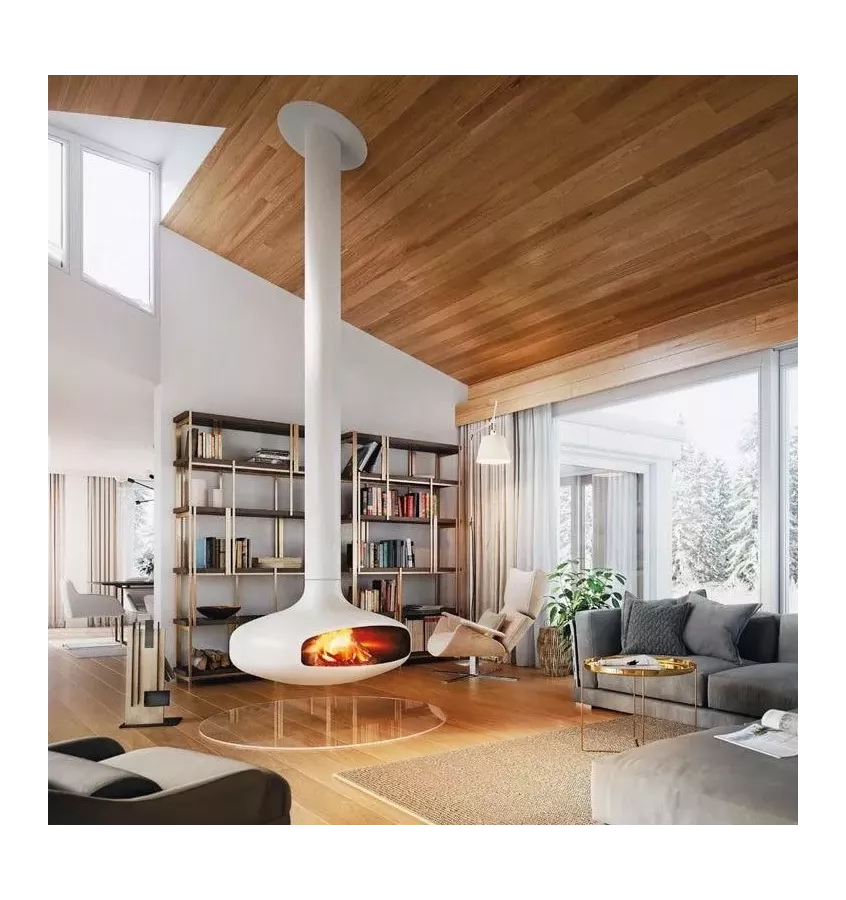 Designerski kominek centralny na drewno, model podwieszany, obrotowy. Wersja biała.