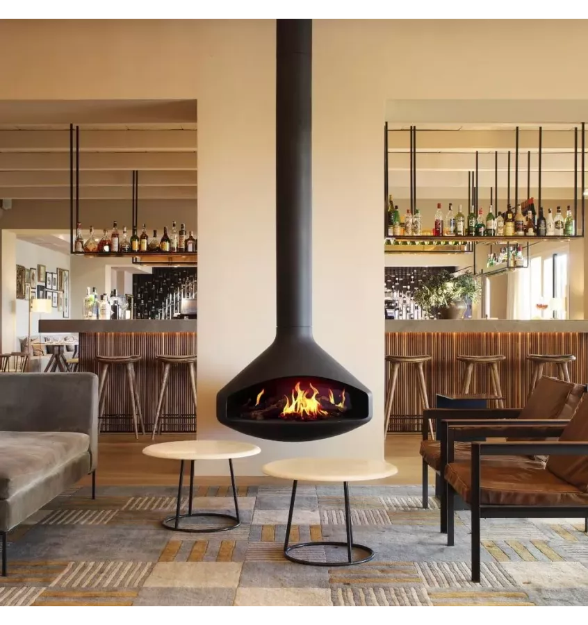 Kominek holograficzny Ergofocus Holographik. Innowacyjne wykonanie kominka - system holograficznych ekranów w połączeniu z prawdziwymi polanami umożliwia trójwymiarowy pokaz ognia z dowolnego punktu widzenia, któremu towarzyszy dźwięk trzaskających płomieni.