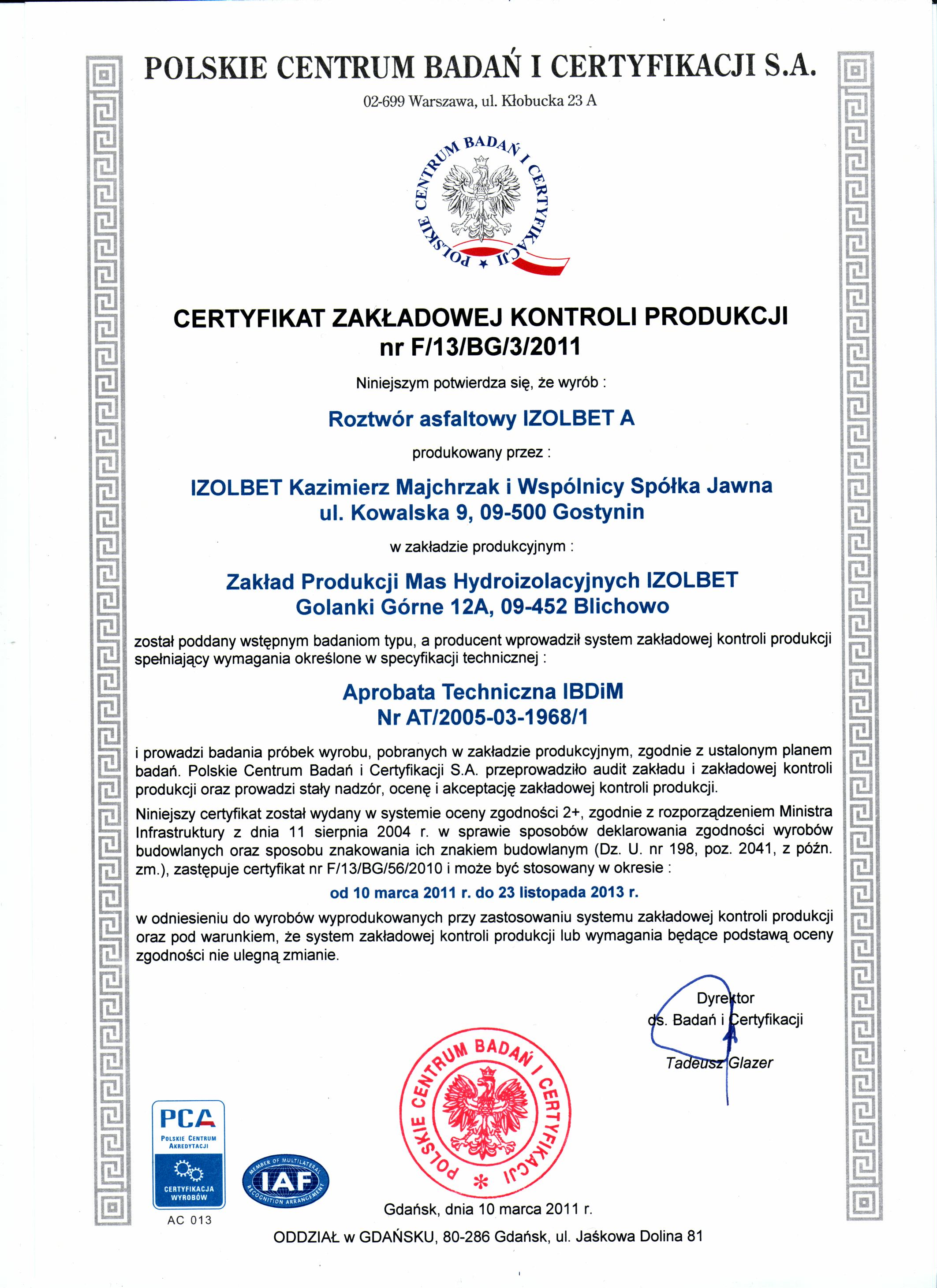 Pobierz plikIzolbet roztwór asfaltowy gruntujący IZOLBET-A Certyfikat