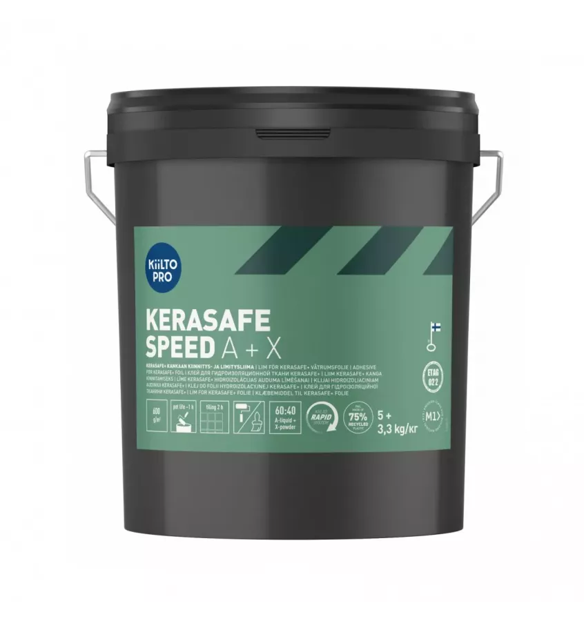 Szybko działający klej cementowy Kiilto Pro KeraSafe Speed A + X. Służy do instalowania folii hydroizolacyjnej, w szczególności Kiilto KeraSafe+, do wilgotnych pomieszczeń za pomocą wałka lub pędzla. Znajduje zastosowanie także do uszczelniania połączeń zakładkowych folii i instalowania arkuszy wzmacniających oraz prefabrykowanych kawałków narożnych.