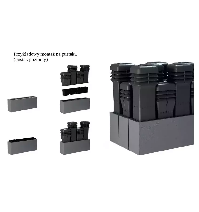 Nasady do wentylacji grawitacyjnej Schiedel - nasada kominowa EcoWent prostokątna. Przeznaczona do wykonywania zakończeń kanałów wentylacji grawitacyjnej. Prostokątny kształt pozwala na bardzo dobre dopasowanie do pustaków wentylacyjnych Schiedel. Montaż na płycie przykrywającej za pomocą prostokątnego adaptera montażowego. W ofercie nasada w wersji niskiej i wysokiej; bez żadnych komplikacji można je odpowiednio zamontować na przemian w pustakach wentylacyjnych wielorzędowych (pionowych lub poziomych).