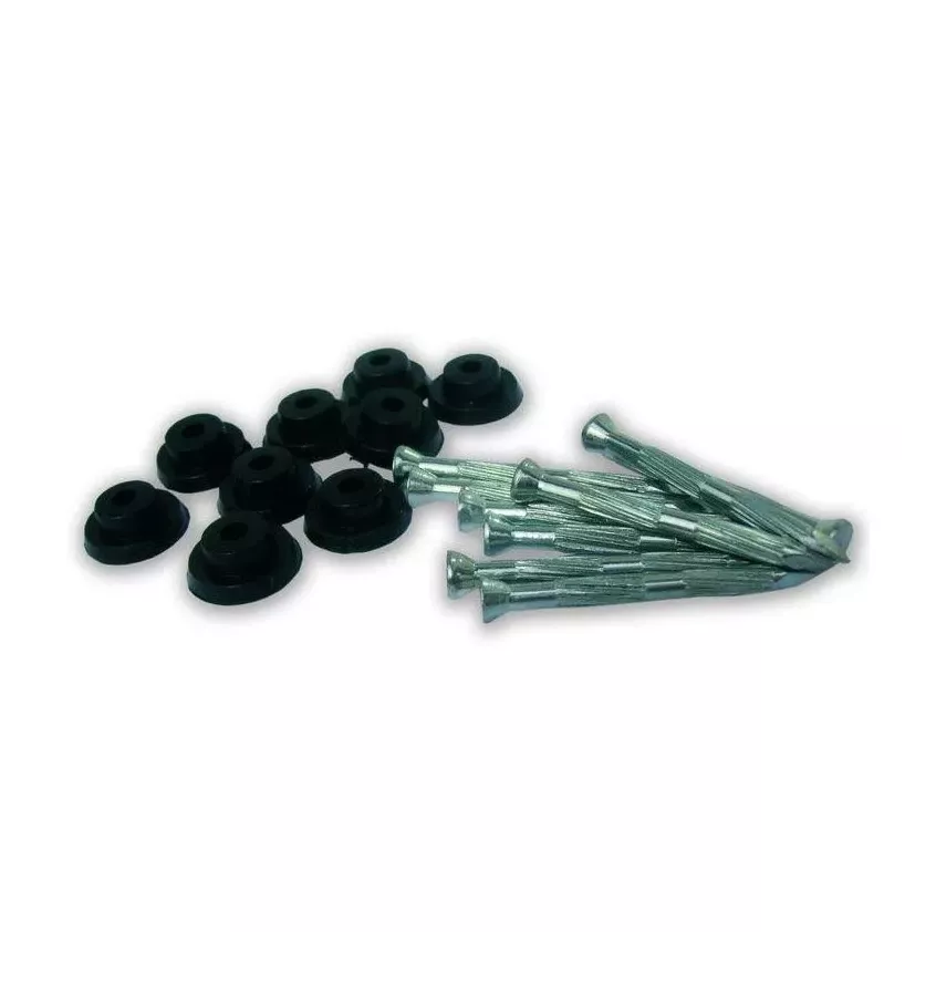 Specjalne gwoździe ze stali hartowanej wykorzystywane do montażu folii fundamentowych o wysokości wytłoczeń 8mm. W komplecie posiadają specjalną podkładkę z tworzywa sztucznego która uszczelnia miejsce montażu gwoździa. Gwoździe w komplecie z podkładką tworzą idealny system montażowy dla folii fundamentowej.