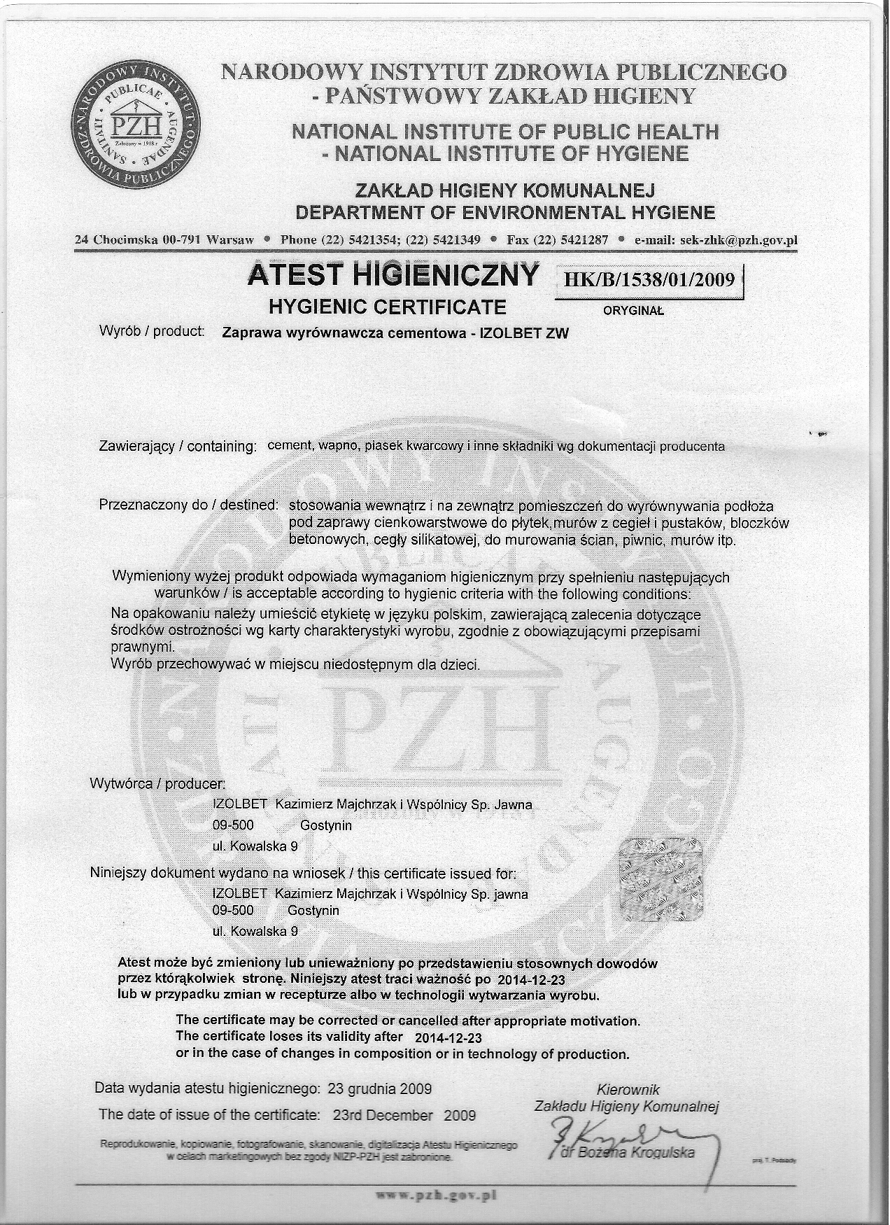 Pobierz plikIzolbet zaprawa wyrównawcza cementowa Izolbet ZW Atest PZH Deklaracja Zgodności
